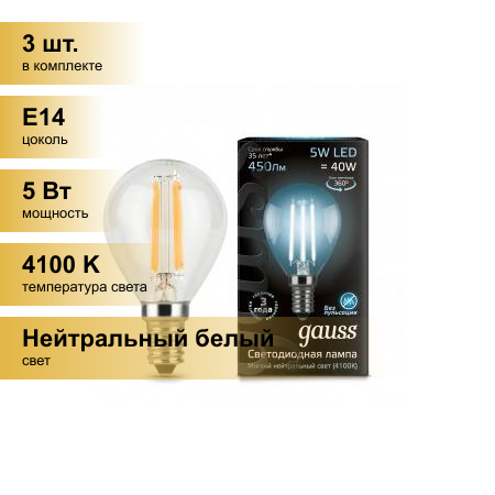 10 цен на (3 шт.) Светодиодная лампочка Gauss Filament Шар G45 E14 5W(450lm) 4100K 4K 80x45 филамент (нитевидная), прозр. 105801205