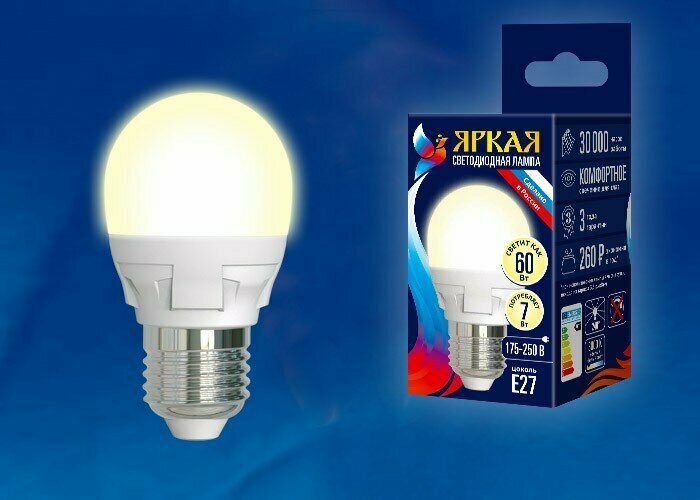Лампа Светодиодная 7W LED-G45/WW/E27 Т/бел МАТ 3000К Яркая Uniel UL-00002420 .