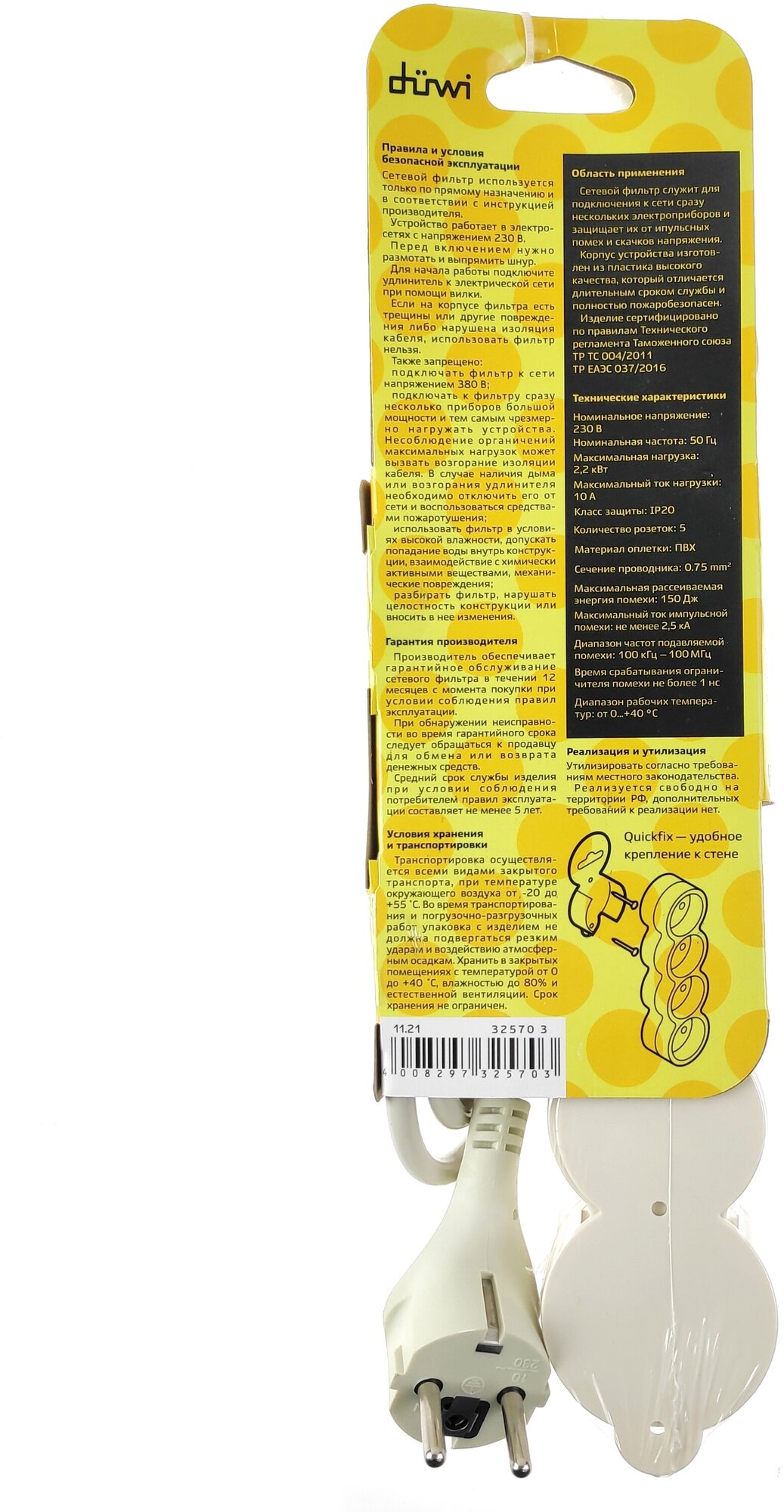 Удлинитель Duwi Quick Fix 32005 2, 3 розетки, с/з, 10А / 2200 Вт