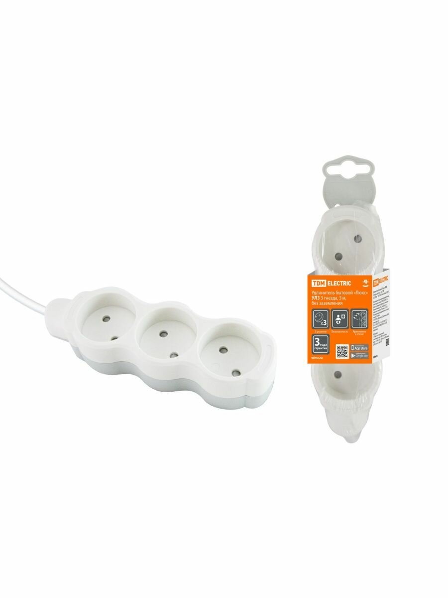 Удлинитель бытовой 3 гн, 3 м, ПВС, 2х0.75 мм2, б/з, 10 А, 250В,с з/ш, бело-сер, TDM, Люкс УЛ3, SQ130