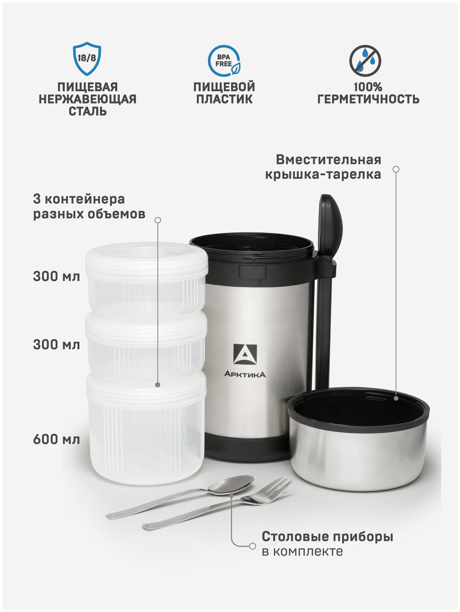 | Комплектация | Термос для еды с широким горлом и 3-мя контейнерами "Арктика", цвет хром, объем 1,5 л, сохраняет тепло 6 ч |