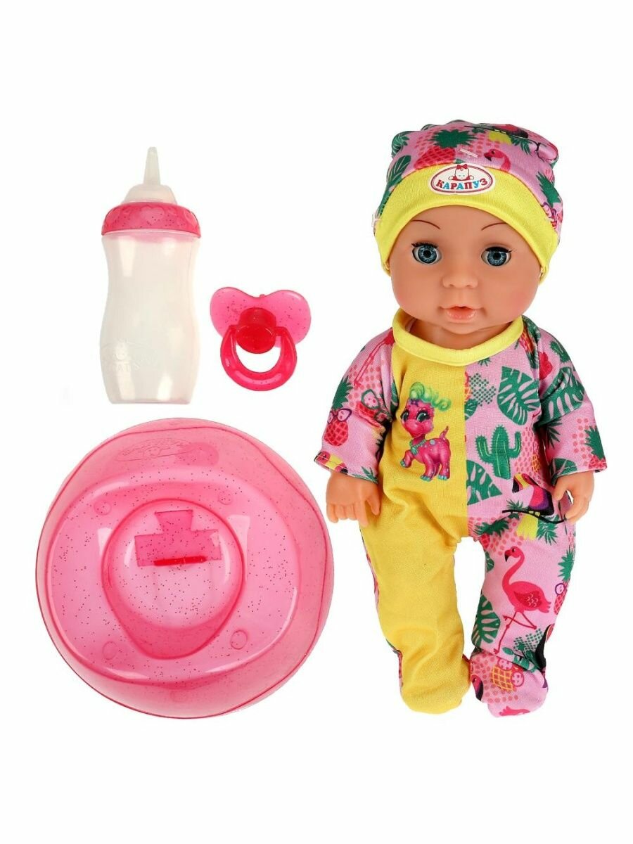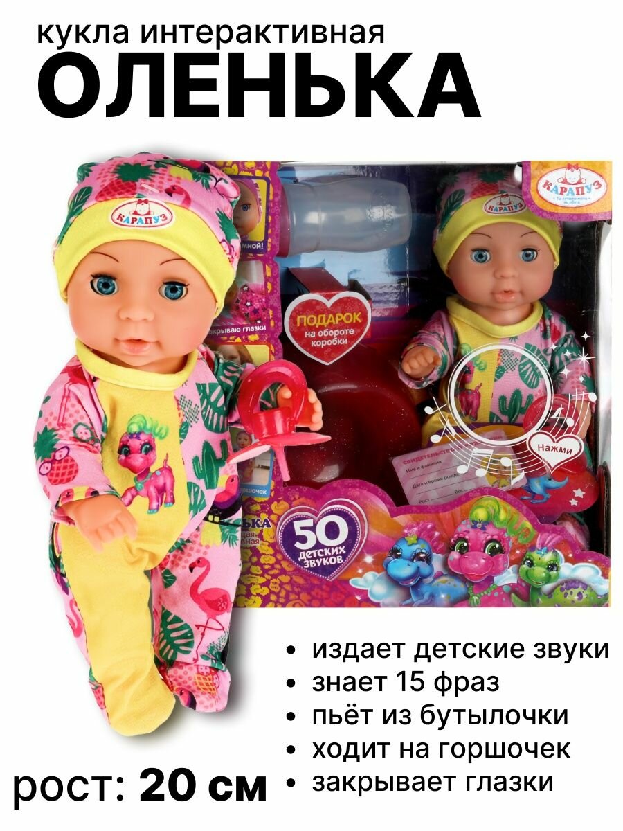 Пупс Карапуз, озвученный Оленька 20см, пьет, пис, закрывает глаза, 50 звуков, 3 аксессуара