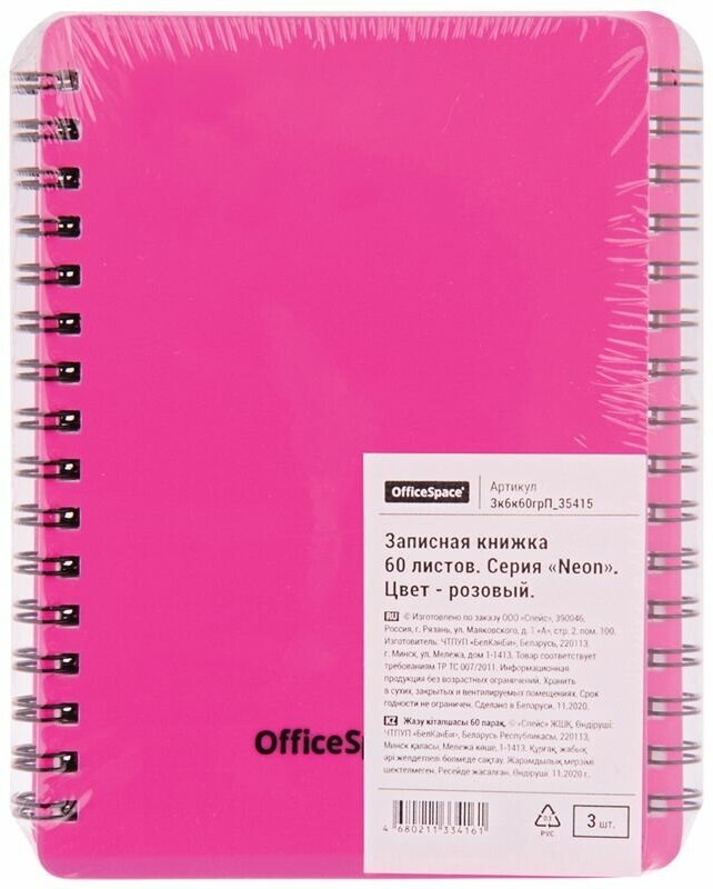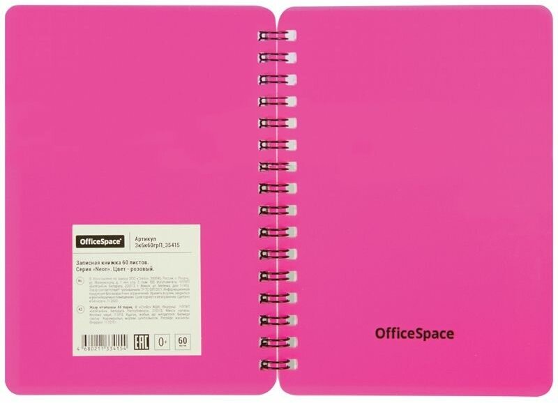 Записная книжка А6 60л., на гребне OfficeSpace "Neon", розовая пластиковая обложка 310420 информация: