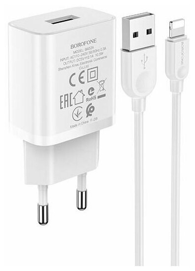 Зарядка для телефона BOROFONE BA52A Gamble 1xUSB, 2.1А + кабель Lightning 8-pin, 1м (белый) информация:
