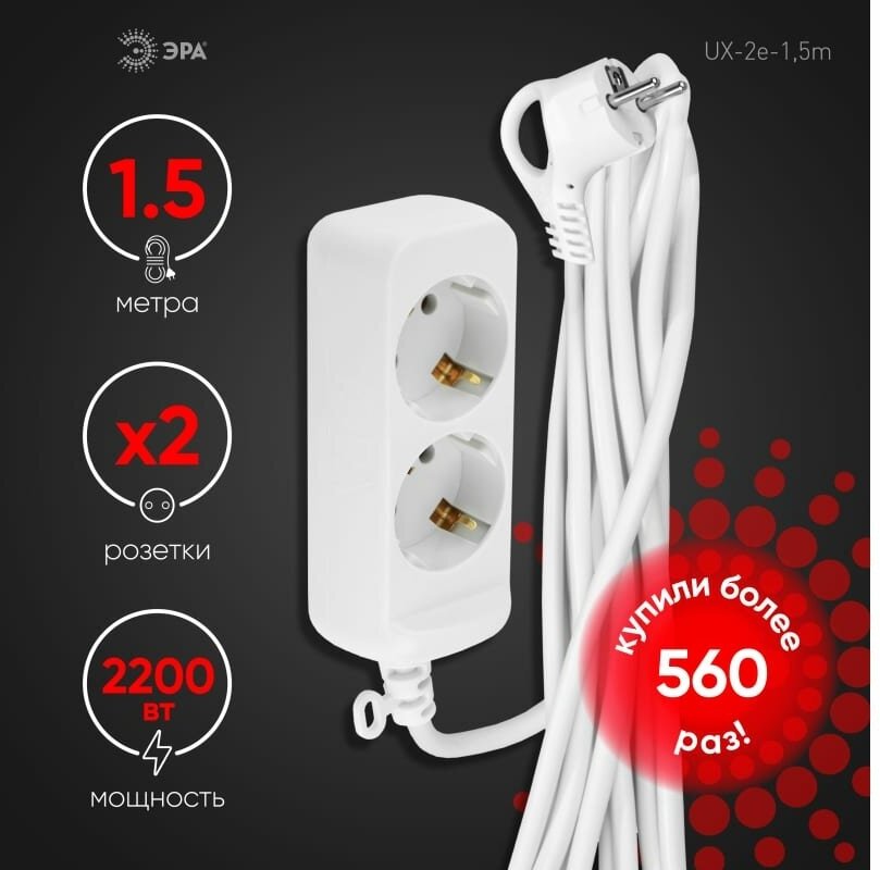 Отзывы на Удлинитель c заземлением ЭРА UX2e1,5m электрический, 2 розетки, 1,5м, ПВС 3x0,75мм2, 10А Б0038572