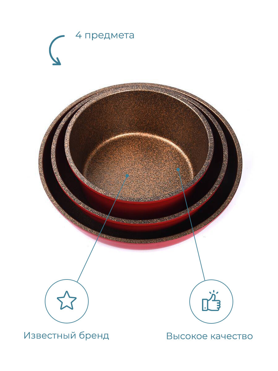 | Дополнительная информация | бакелитовая ручка, антипригарное шестислойное покрытие 50 микрон, подарочная упаковка, диаметр: сковороды 26см, сотейника 22см, ковша 18см |