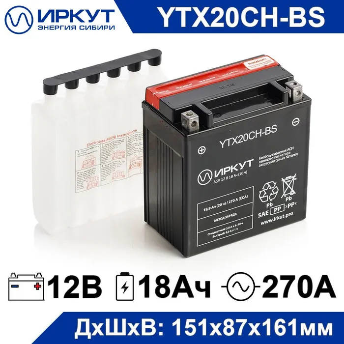 Аккумулятор Мото 12V 18 Ач 151Х87х161 270А +/- Agm Сух.зар. + Пакет С Кислотой Гарантия 1 Год иркут арт. YTX20CH-BS информация: