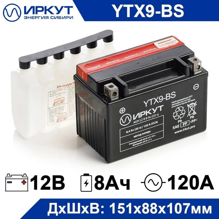 Мото аккумулятор иркут YTX9-BS 12 В, 8 Ач, 120 А, для электромобиля, аварийного освещения, кассового терминала, весов, GPS оборудования, фонаря