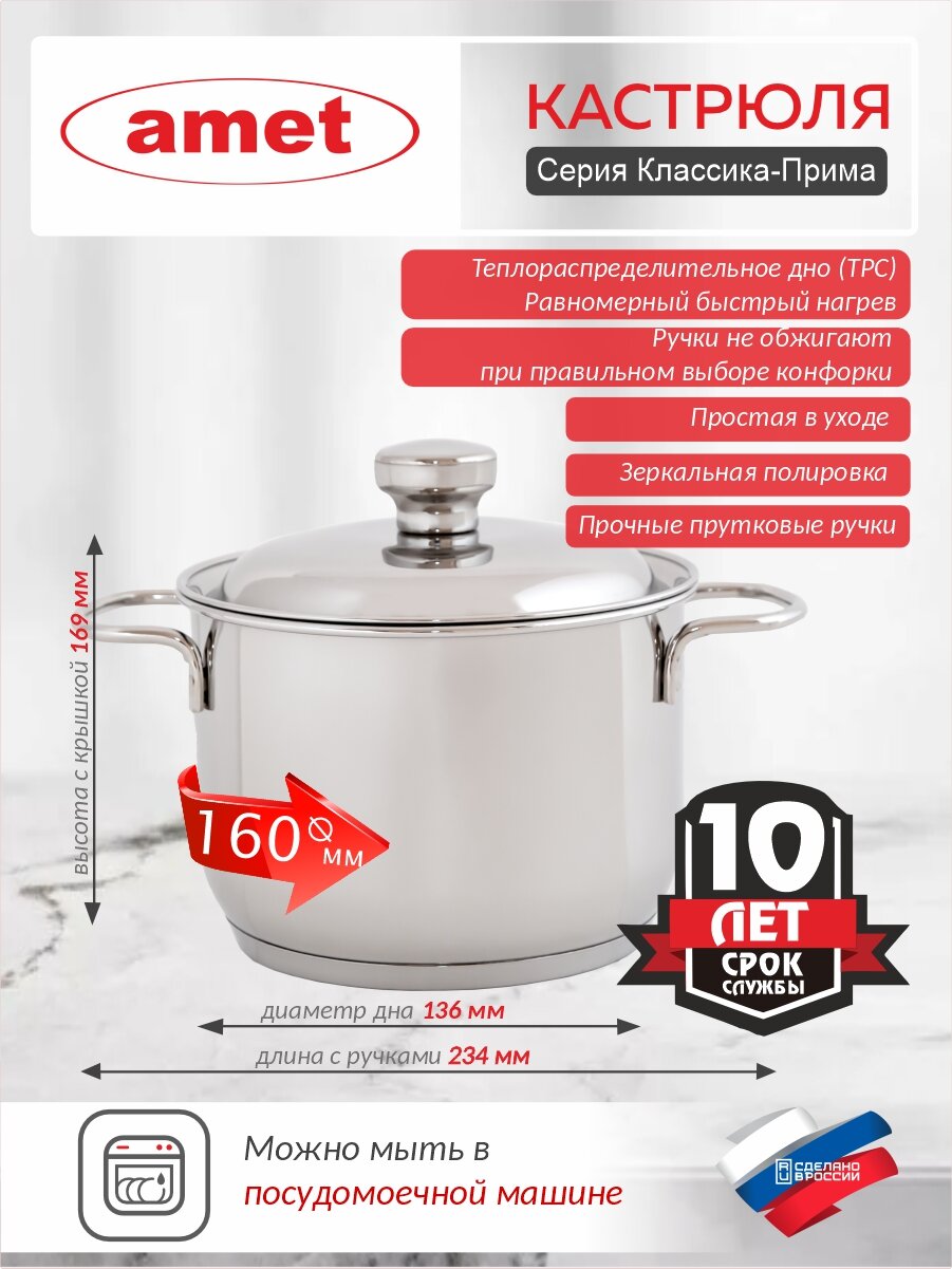 Амет ТРС-3 Классика-Прима, Кастрюля 4,0 л из нержавеющей стали (объемные ручки)