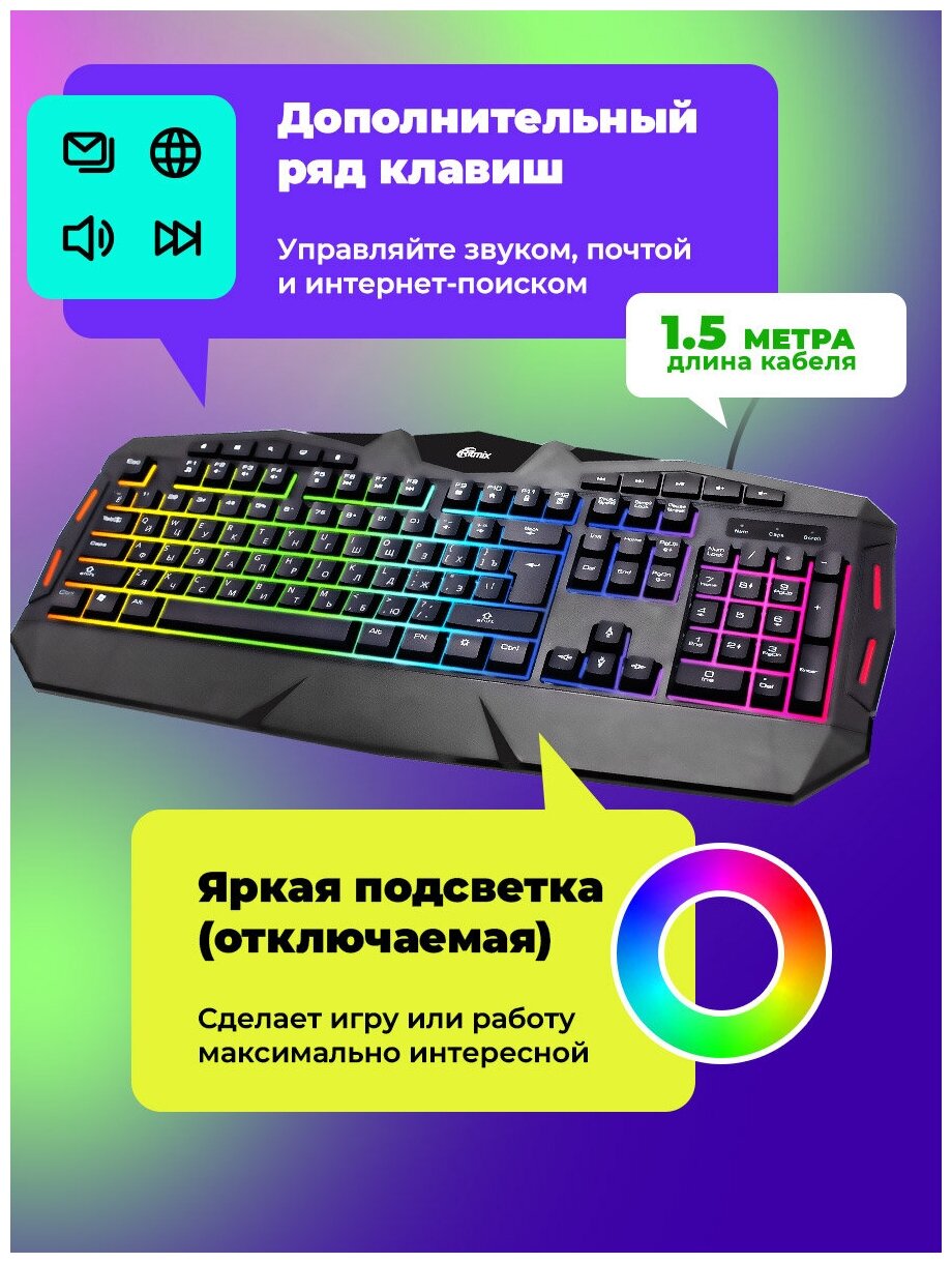 Клавиатура игровая RITMIX RKB-555BL, корп:пласт,Подсв:настр.реж.ярк,Подкл:проводUSB,ткан опл каб,клав:104,мульти:10 информация: