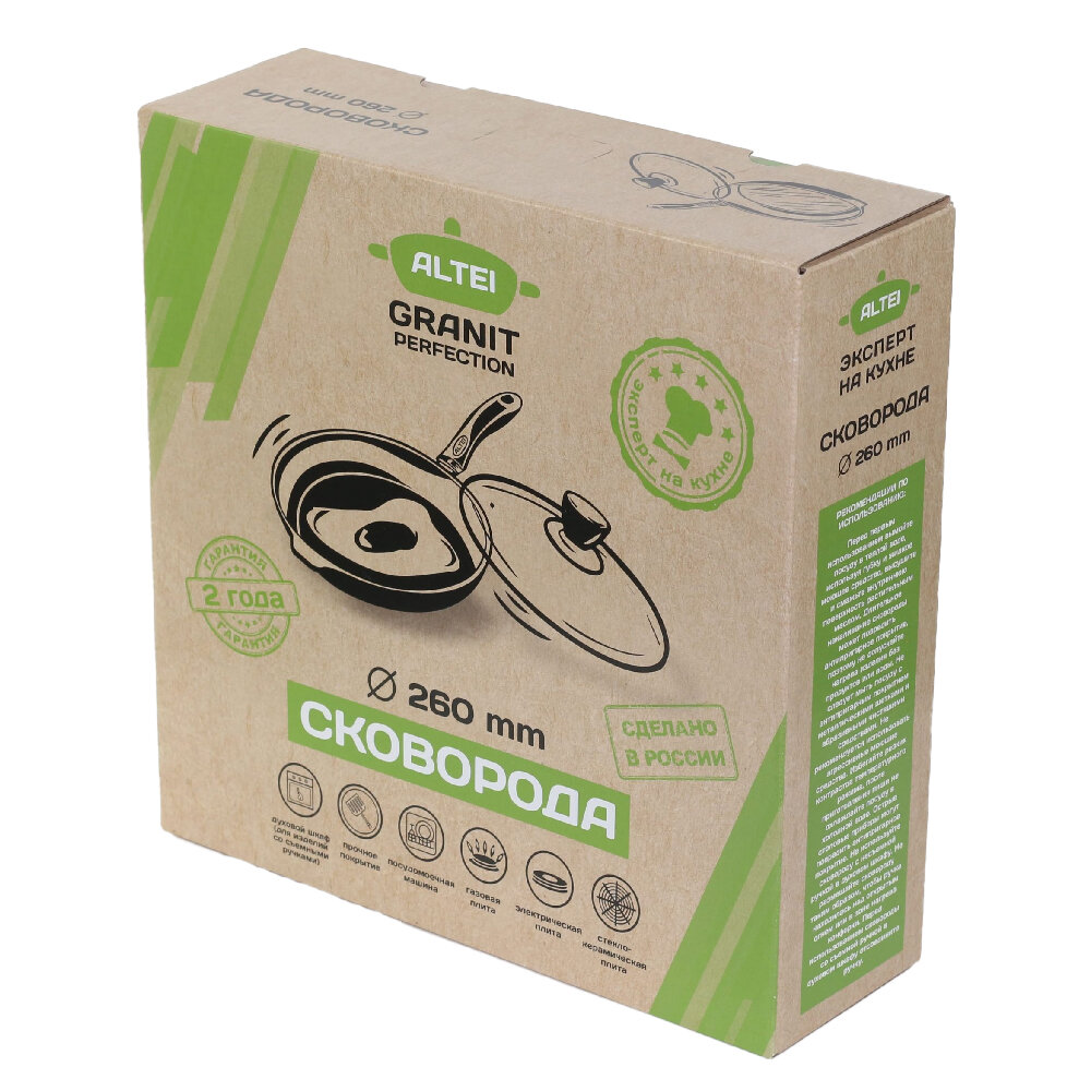 | Комплектация | Сковорода 260мм съемная ручка, стеклянная крышка, антипригарное покрытие "Granit Perfection black" ALTEI - 1шт. |