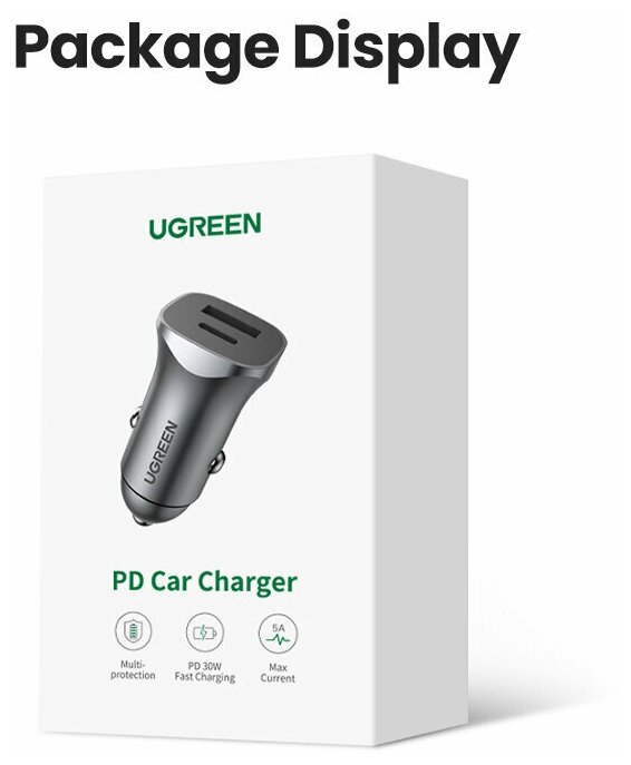 Автомобильное зарядное устройство UGREEN CD130 USB-C PD+USB-A QC 30W Fast Car Charger + SCP2 .5W, серый 1 805 ₽