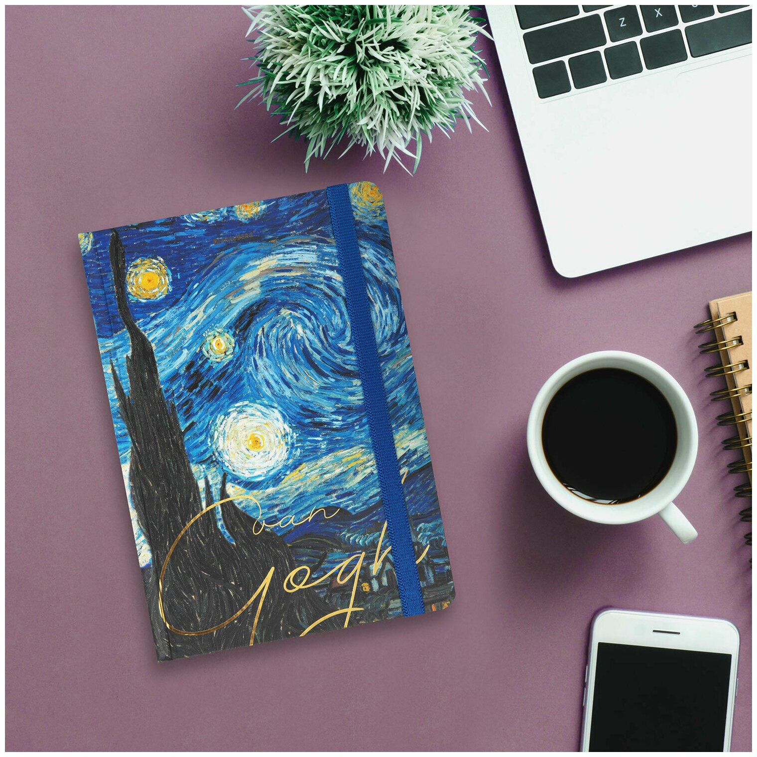 Блокнот с резинкой в клетку 96 л., А5 (145х203 мм), твердая обложка с фольгой, BRAUBERG, "Van Gogh", 113728 113728