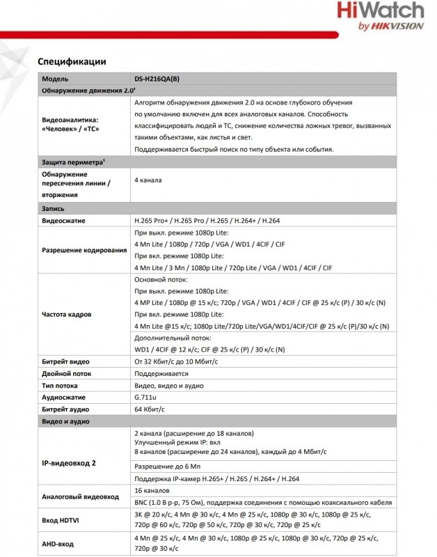 | Дополнительная информация | идеорегистратор DS-H216QA(B) является цифровым видеорегистратором TURBO HD • Алгоритм обнаружения движения 2.0 на основе глубокого обучения для всех аналоговых каналов • Защита периметра на основе глубокого обучения • H.265 Pro+ / H.265 Pro / H.265 • Видеовходы HDTVI / AHD / CVI / CVBS / IP • Аудио по коаксиальному кабелю • IP-видеовходы: до 24 каналов • До 10 TБ каждый HDD |
