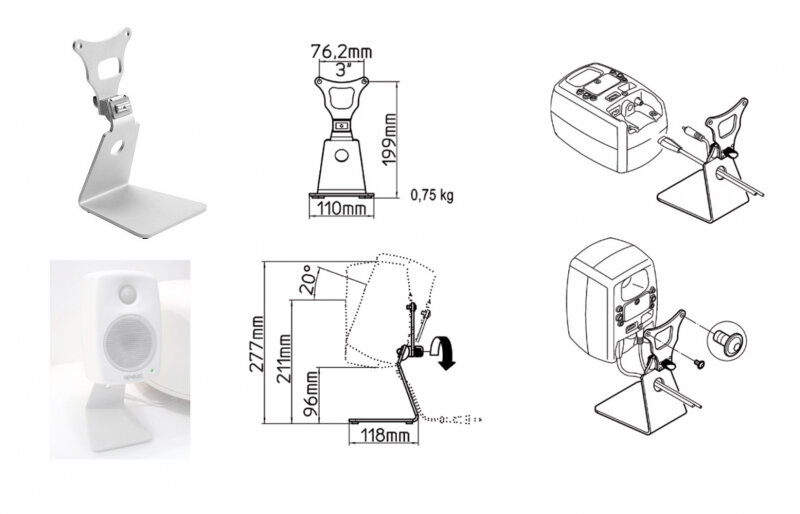 Genelec 8010-320W настольная L-образная стойка для мониторов G One, 8010 и 4010. Регулируемый угол наклона. Снижает нежелательные отражения от поверхности стола. Высота 199мм. Габариты основания 118x110мм. Белая