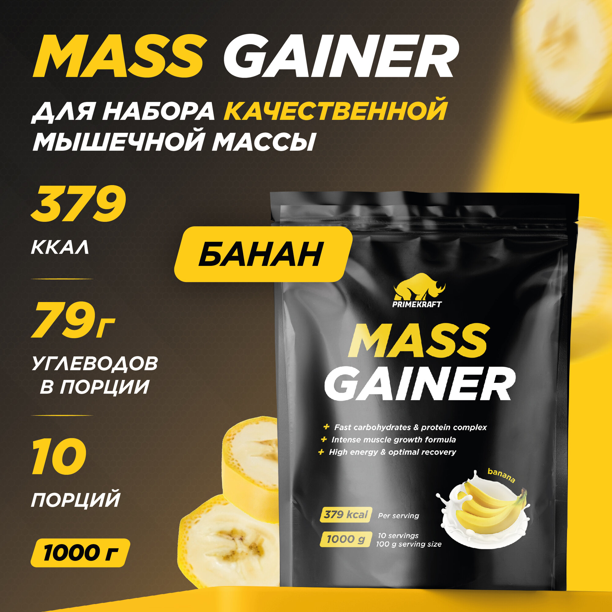 10 цен на Гейнер белково-углеводный PRIMEKRAFT/ MASS GAINER для набора массы со вкусом "Банан" 1000 гр