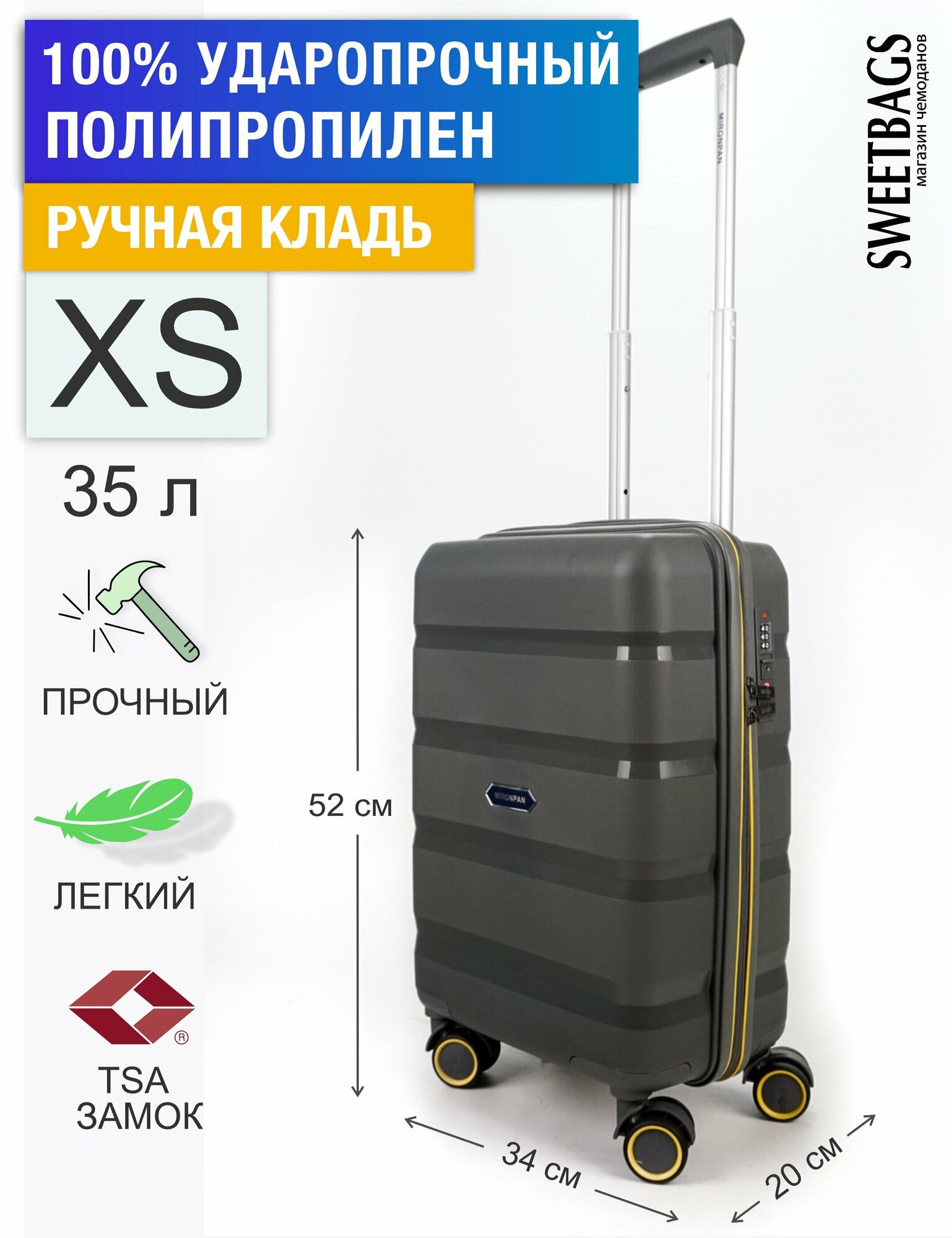 Отзывы на Чемодан Sweetbags маленький (ручная кладь) из полипропилена на 4-х колесах с TSA замком (4 гориз. полосы) серый с желтой каемкой XS