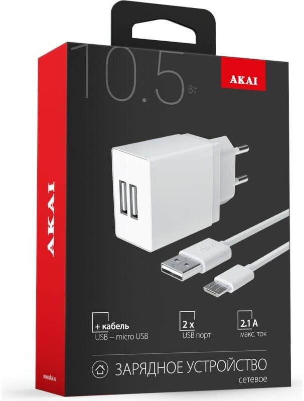 AKAI СЗУ CH-6A05 универсальное 2 USB 2.1A + кабель micro USB белый CH-6A05W