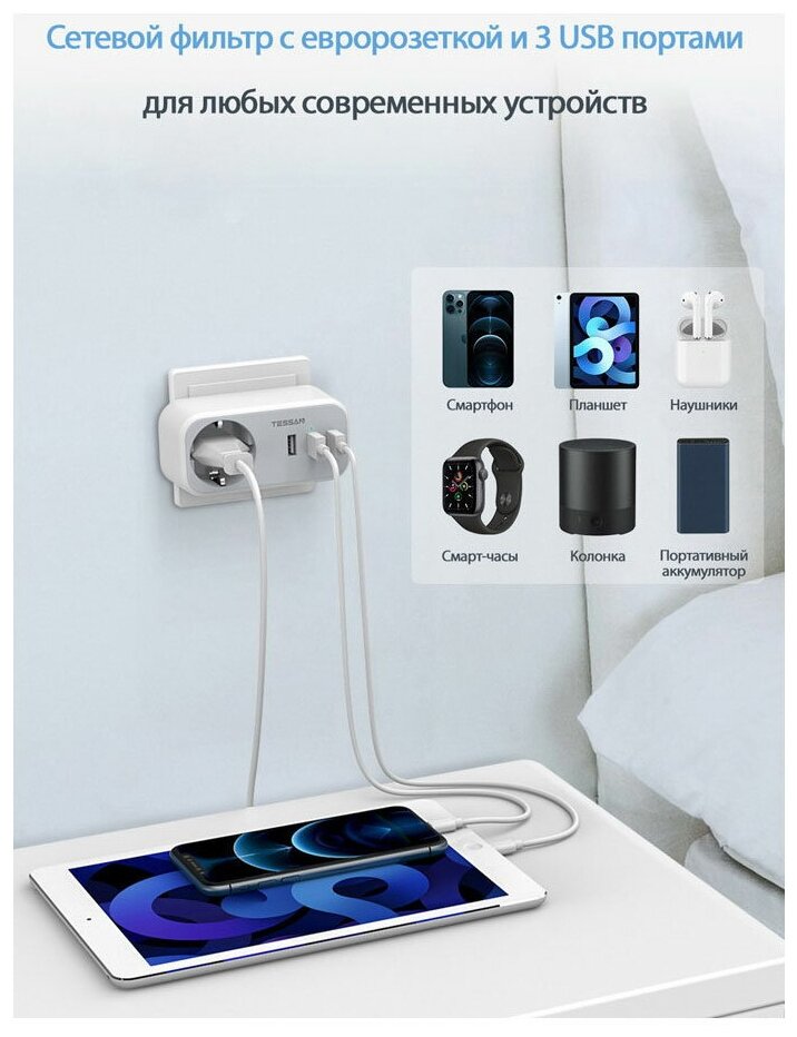 Сетевой фильтр без провода TESSAN TS-301-DE-C 3 розетки 2500 Вт + USB зарядка 2 порта до 3А + 1порт USB-C серый