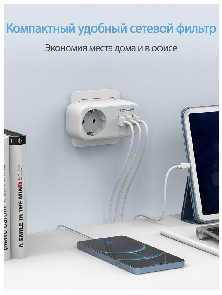 Сетевой фильтр без провода TESSAN TS-332 -DE 1 розетка универсальная , 1 порт USB, встроенный кабель USB-C серый