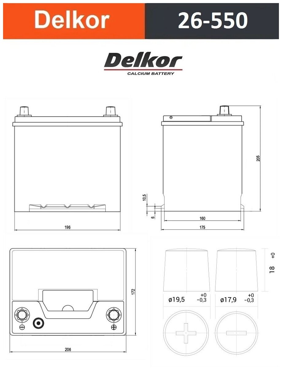 Аккумулятор автомобильный DELKOR 26R-550 60 Ач, пуск. ток 550 А, обрат. полярность, 206x172x205 информация: