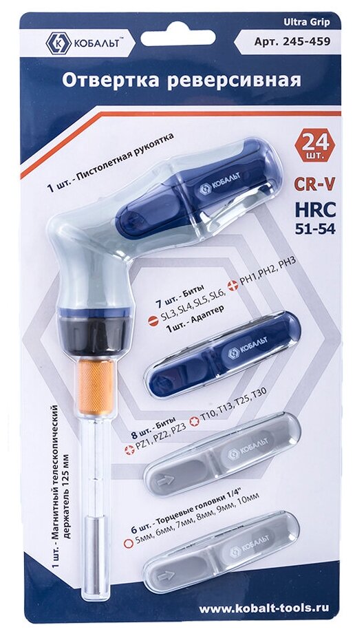 Отвертка реверсивная кобальт Ultra Grip пистолетная, телескопическая,с набором бит и торцевых головок 1/4", CR-V (24 шт.) блистер