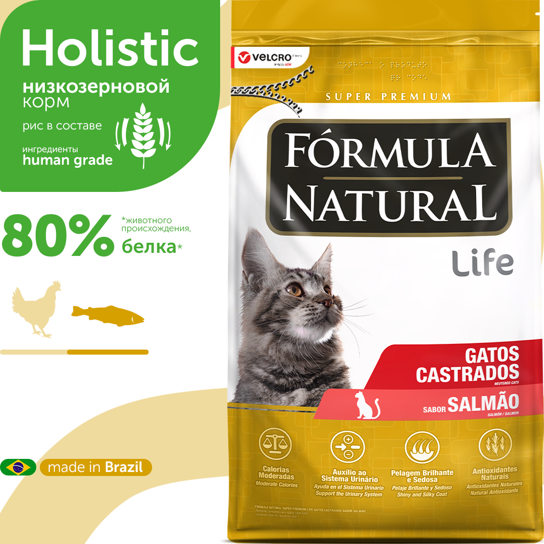 10 цен на Сухой корм для стерилизованных или кастрированных кошек и котов, Formula Natural Life Super Premium - низкозерновой, с лососем, Бразилия, 1 кг