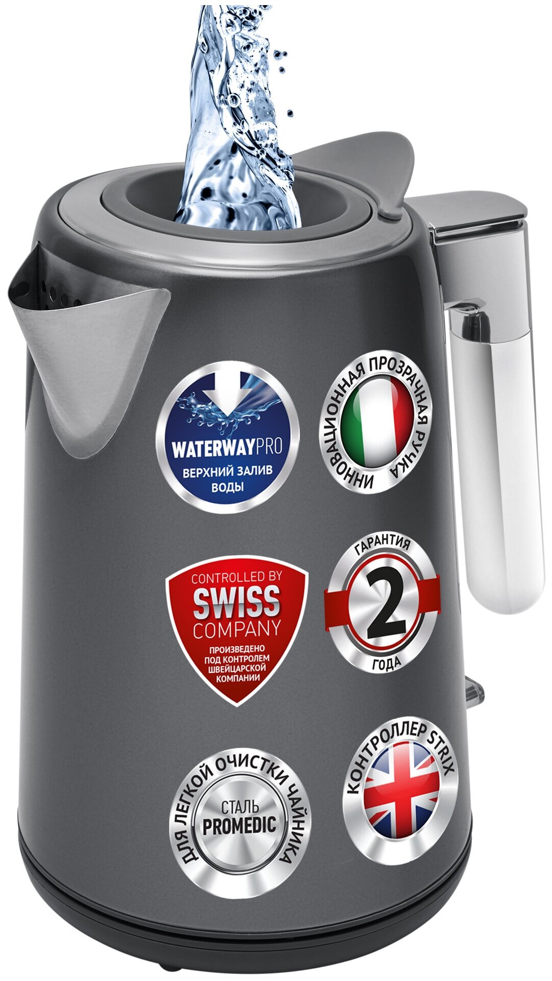 Чайник электрический Polaris PWK 1746CA Water Way Pro, 1,7 л, сталь, пластик серый