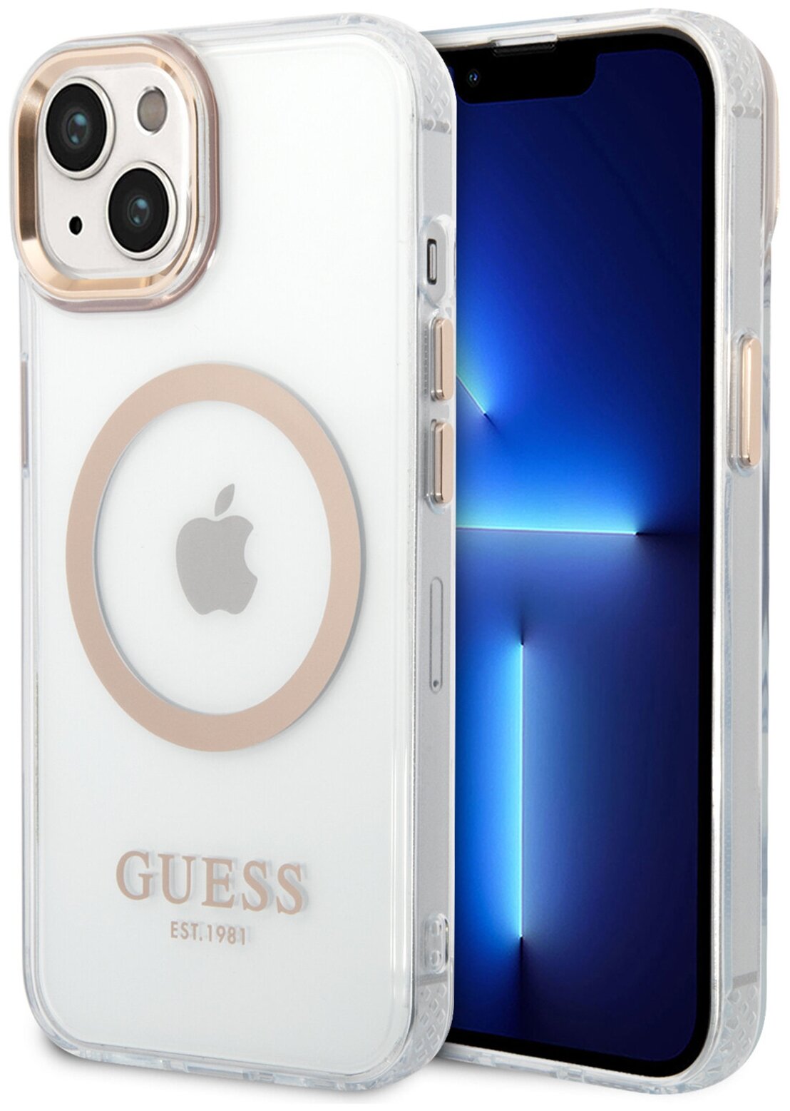 10 цен на Guess для iPhone 14 чехол PC/TPU Metal outline Hard Transparent/Gold (Magsafe)