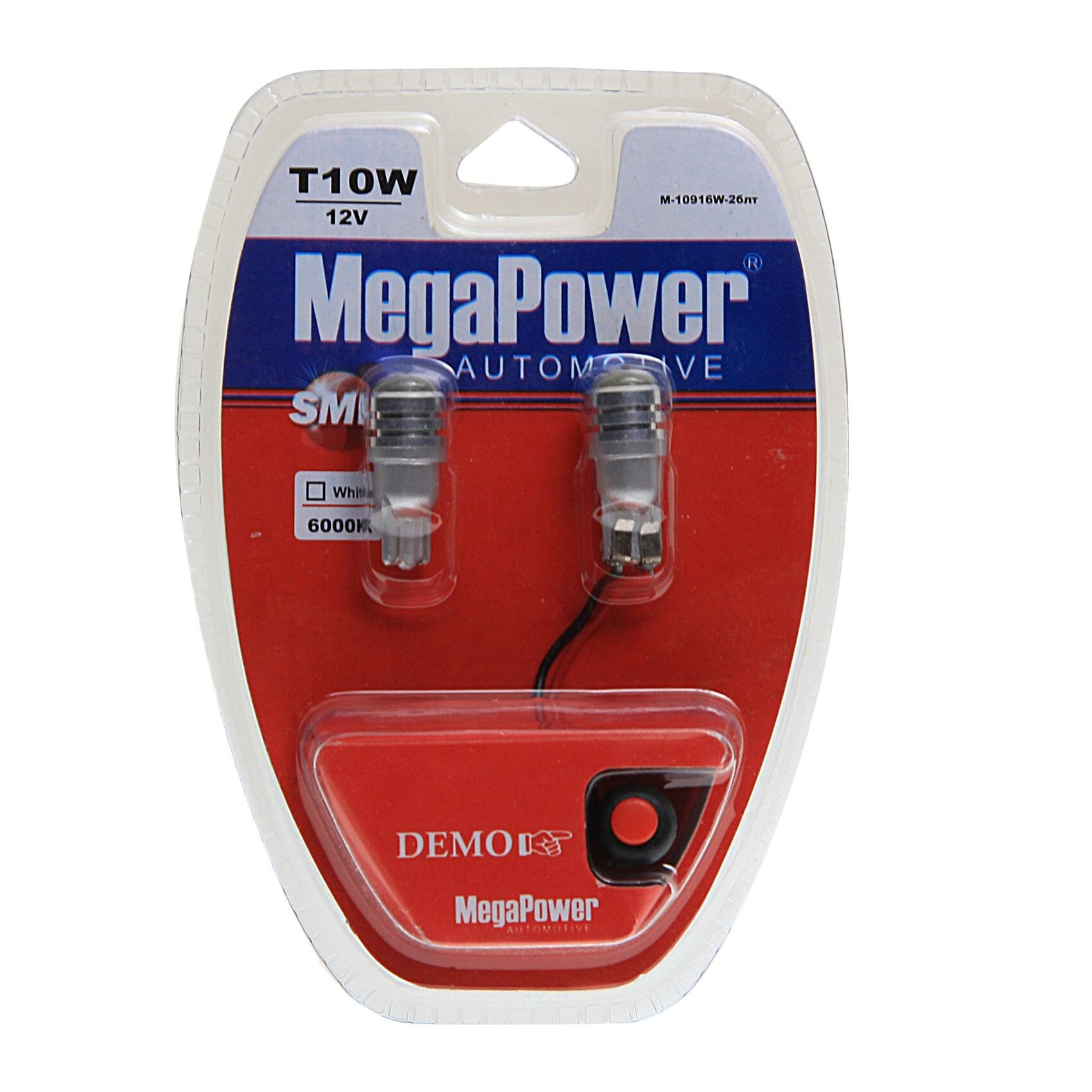 MEGAPOWER-AUTOMOTIVE 10916W-2БЛТ Лампа светодиодная 12V W5W T10 W2.1x9.5d 6000K с тестером блистер (2шт.) MEGAPOWER