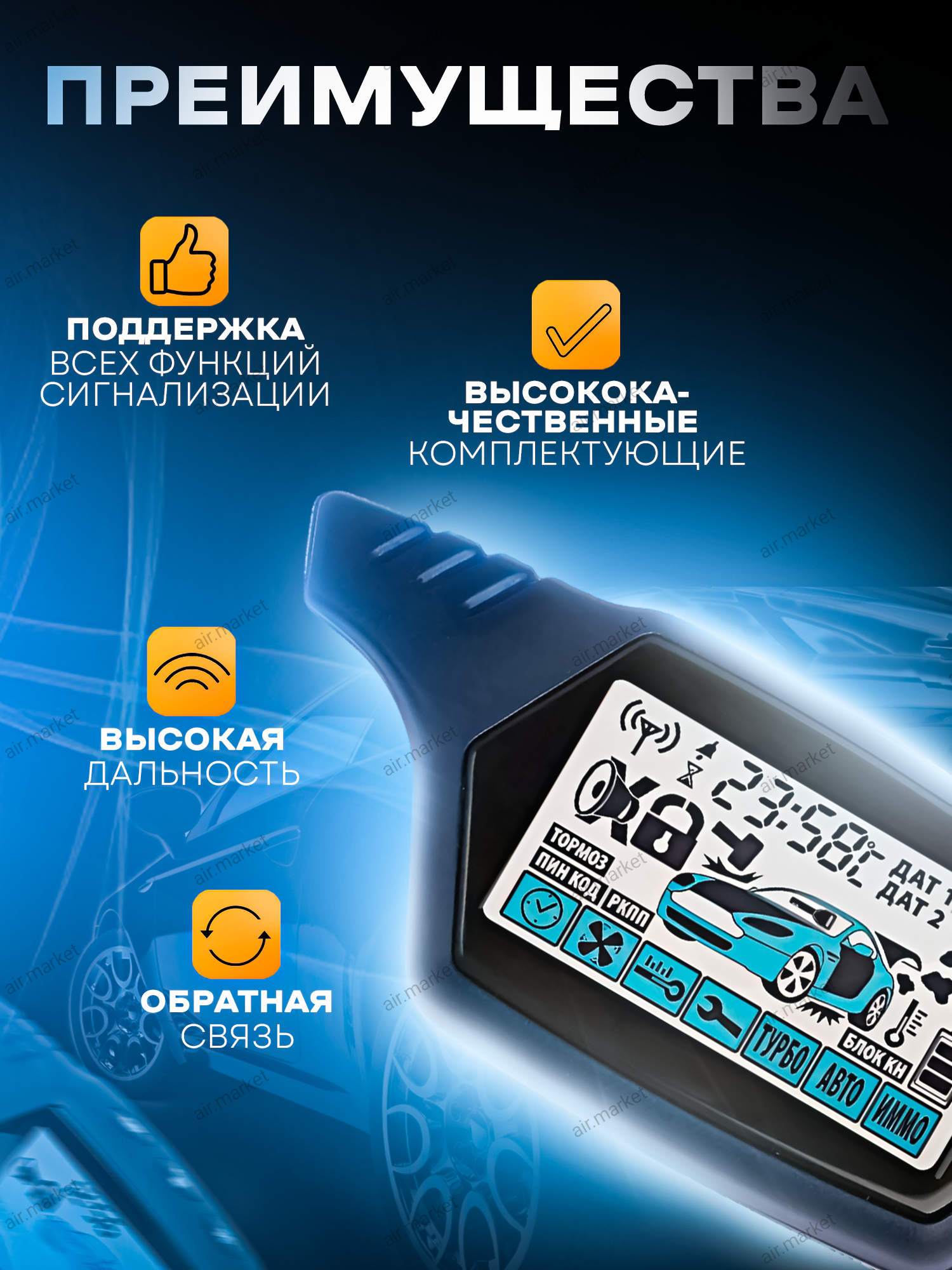 | Дополнительные функции и возможности | Автозапуск двигателя, Турботаймер, Пылевлагозащищенный корпус, Возможность установки на все типы автомобилей |