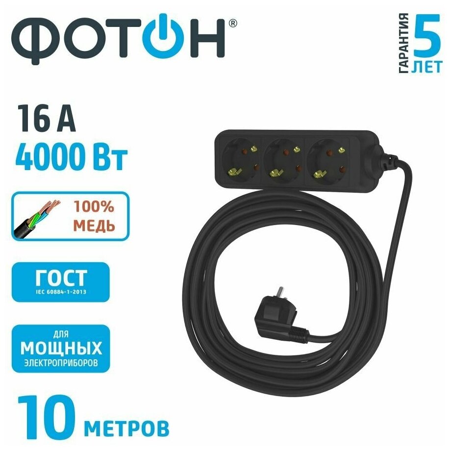 10 цен на Сетевой удлинитель Фотон 16-103Е, 10м, 3 розетки, 16А, с заземлением, черный 22725