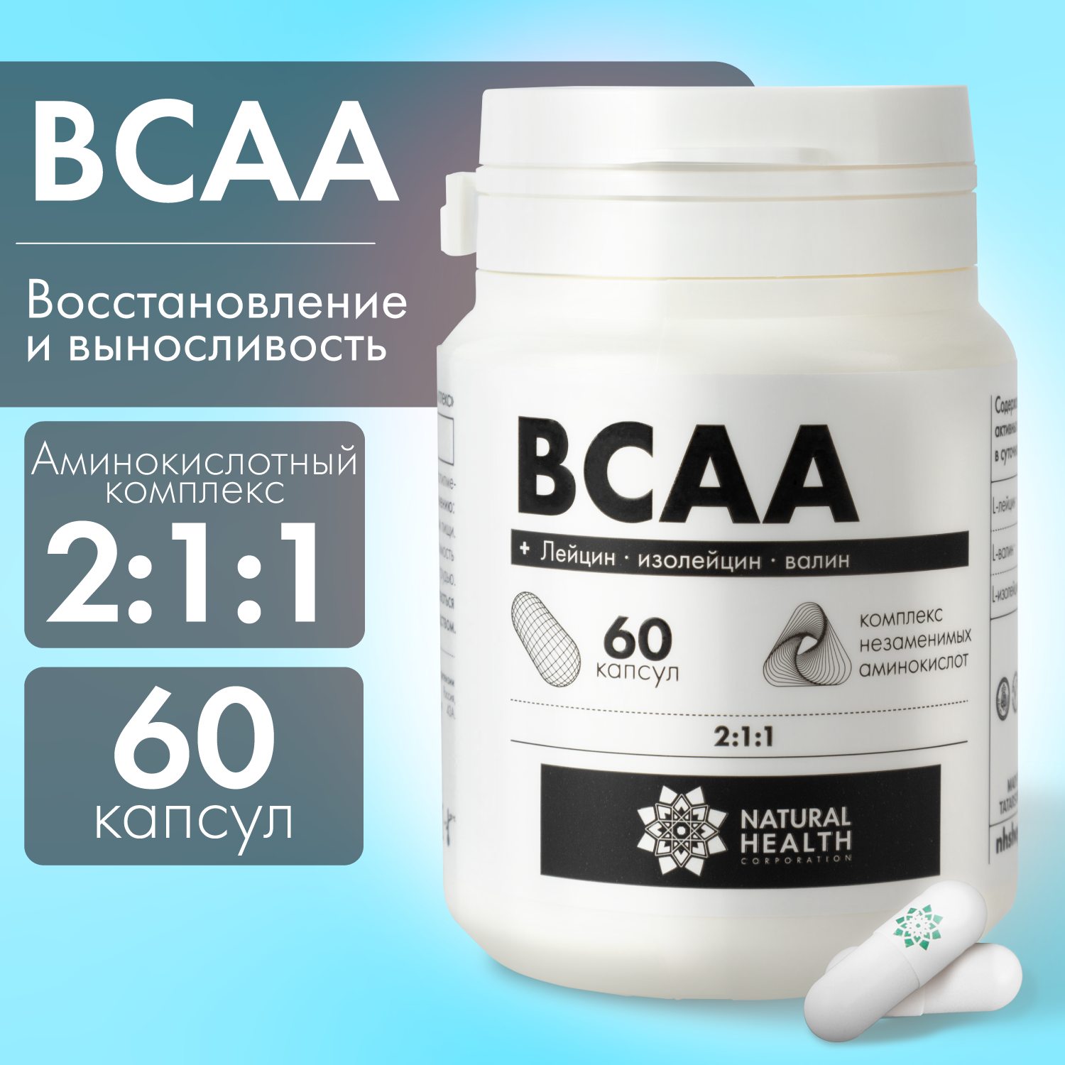 Аминокислоты BCAA 2:1:1 Natural Hеalth в капсулах, 60 капсул без добавок, спортивное питание для мужчин и женщин, L-лейцин, L-изолейцин, L-валин информация: