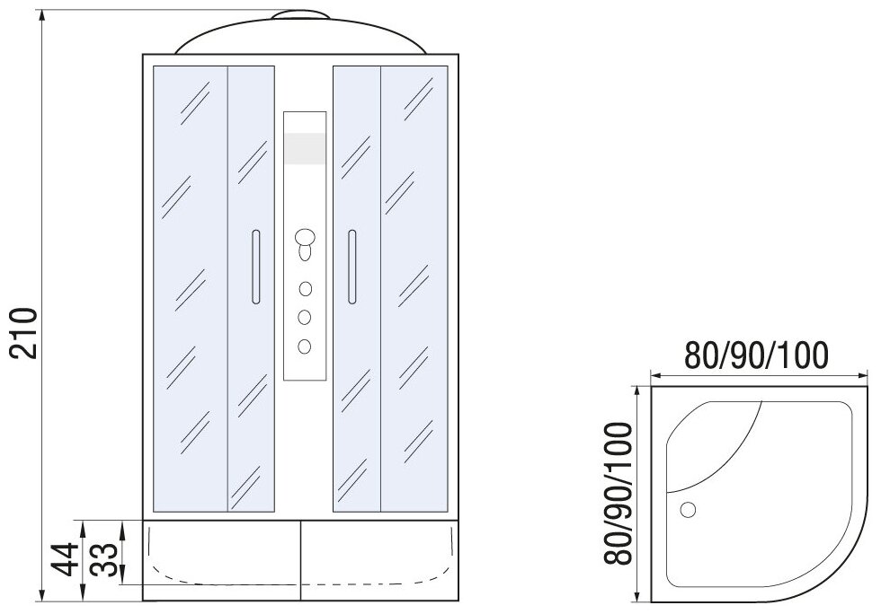 | Комплектация | душевая лейка, зеркало, поддон, полки, сиденье |