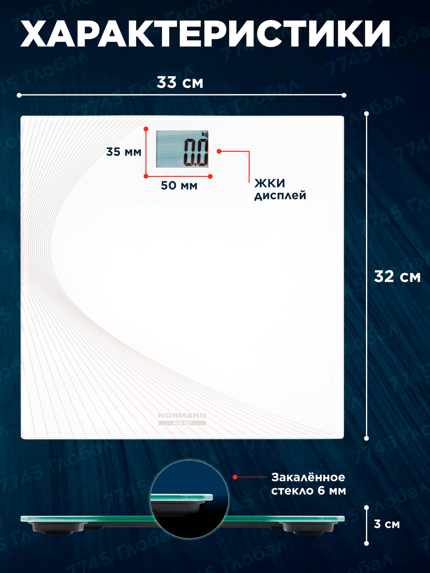 Весы напольные ASB-461 NORMANN (180 кг; стекло 6 мм; дисплей 50х35 мм) (ASB-461) 921 ₽
