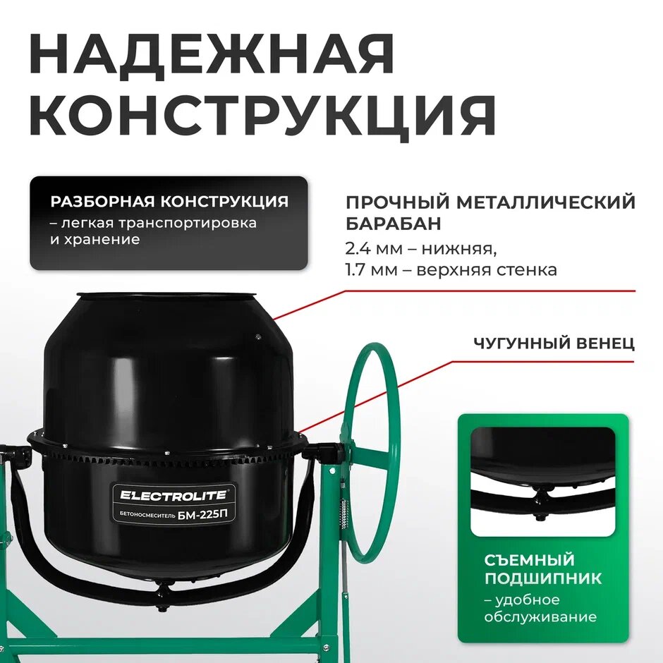 Бетоносмеситель строительный / Гравитационная бетономешалка электрическая Electrolite БМ-225П (1200 Вт, 225 л, педаль, чугунный венец) информация: