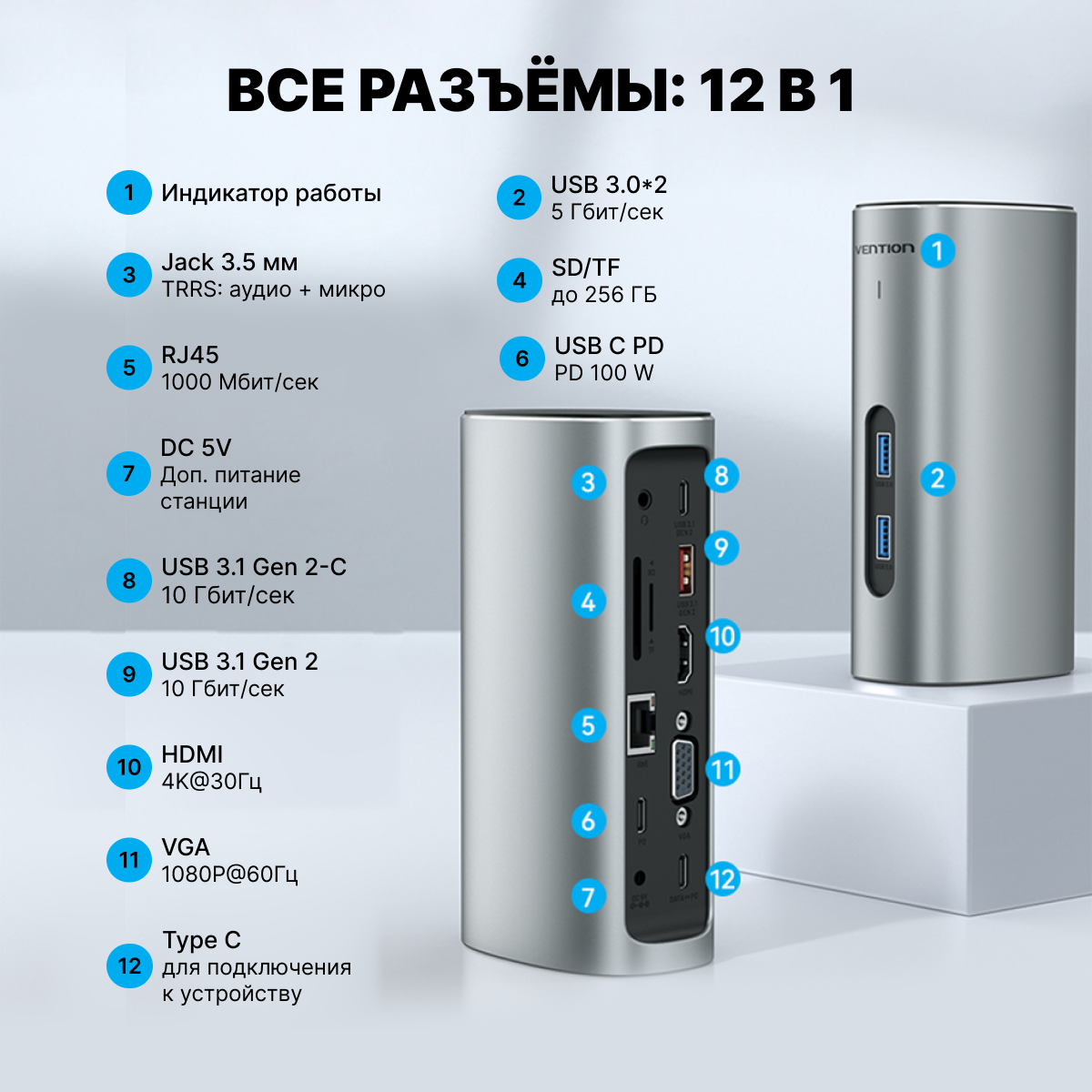 Vention Док-станция Vention USB-C to HDMI/VGA/USB 3.1 Gen 2/USB 3.1 Gen 2-C/USB 3.0x2/RJ45/SD/TF/TRRS 3.5mm/PD/DC Docking Station Gray Vertical Aluminum Alloy Type EU Standard 8 260 ₽