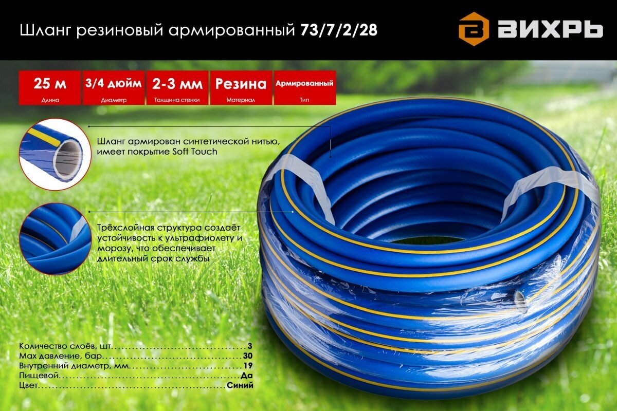 Отзывы на Шланг резиновый армированный Вихрь 19х25-1,0 - ВГ., бухта 25 м (синий с жёлтой полоской) ТЭП, 73/7/2/28