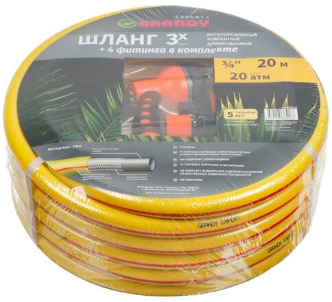 Отзывы на Шланг поливочный, 3/4 '', 20 мм, 20 атм, армированный, 20 м, 3 слоя, Grandy, Expert, ПВХ, антиторсионный, PGH-19B-20
