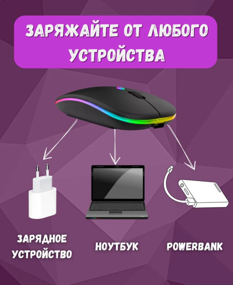 10 цен на Мышь беспроводная компьютерная аккумуляторная, 3 режима DPI (800/1200/1600) Bluetooth + USB 2.4Ghz, RGB подсветка, Черная
