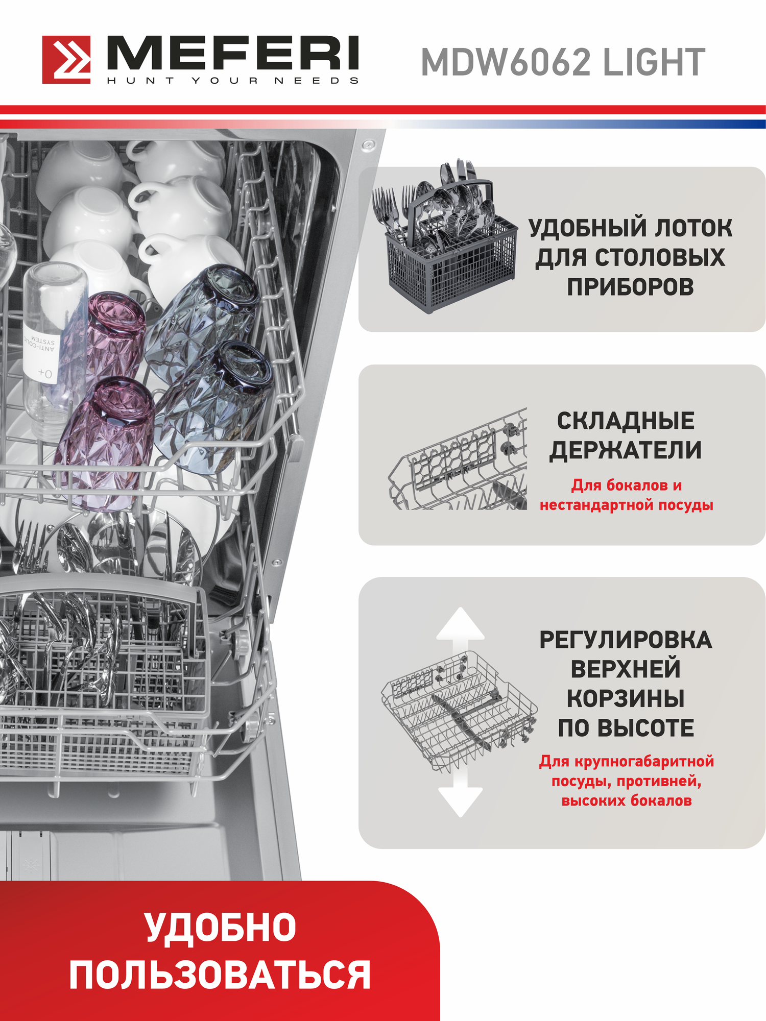 Посудомоечная машина встраиваемая MEFERI MDW6062 LIGHT, 60 см, с защитой от протечек информация: