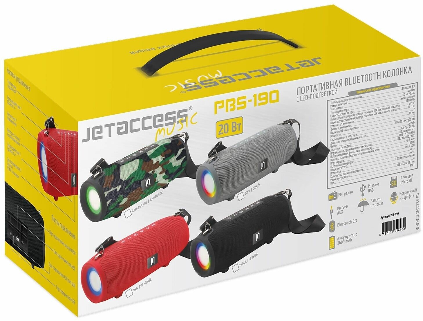 Портативная BLUETOOTH колонка JETACCESS PBS-190 камуфляж (2x10Вт дин., 3600mAh акк.LED подсветка) информация: