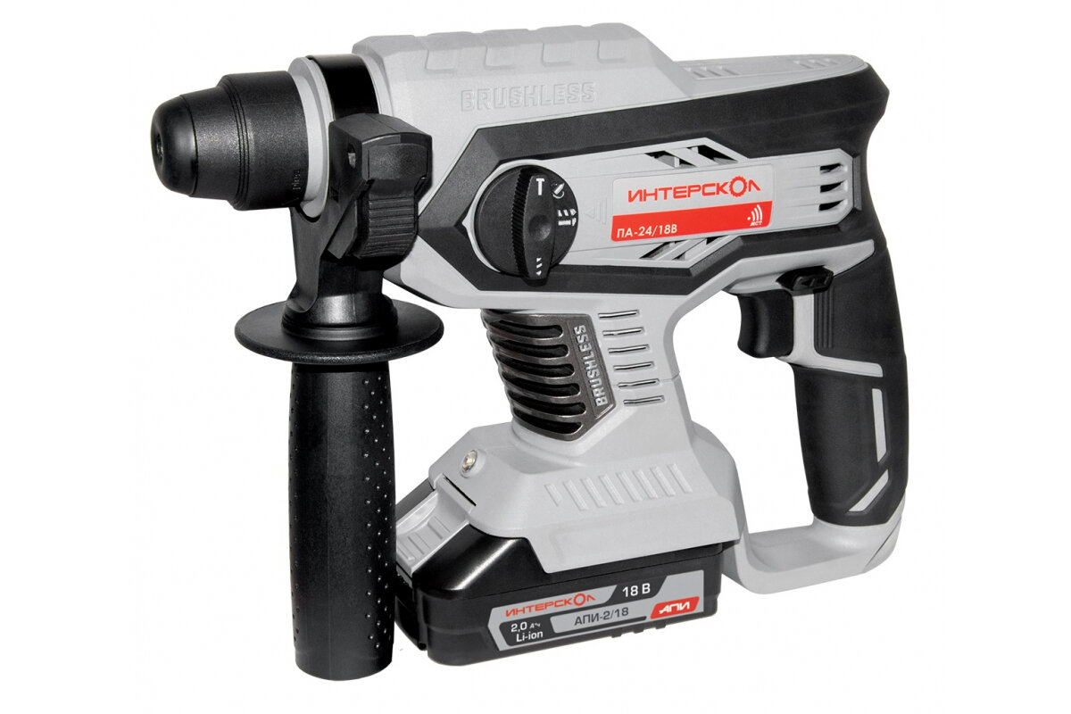 Бесщеточный профессиональный аккумуляторный трехрежимный перфоратор ИНТЕРСКОЛ ПА-24/18ВM с вентильным двигателем.