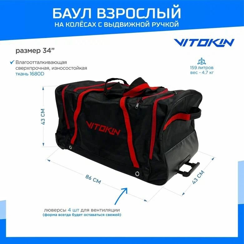 Отзывы на Баул на колесах хоккейный с карманами и ручкой VITOKIN, размер 34" взрослый черный с красным