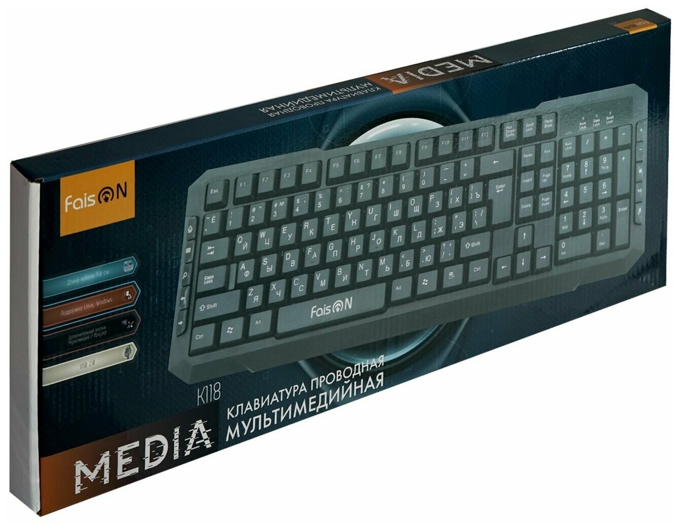 Клавиатура проводная FaisON, MEDIA, K118, мультимедийная, 1.5 м, цвет: чёрный информация: