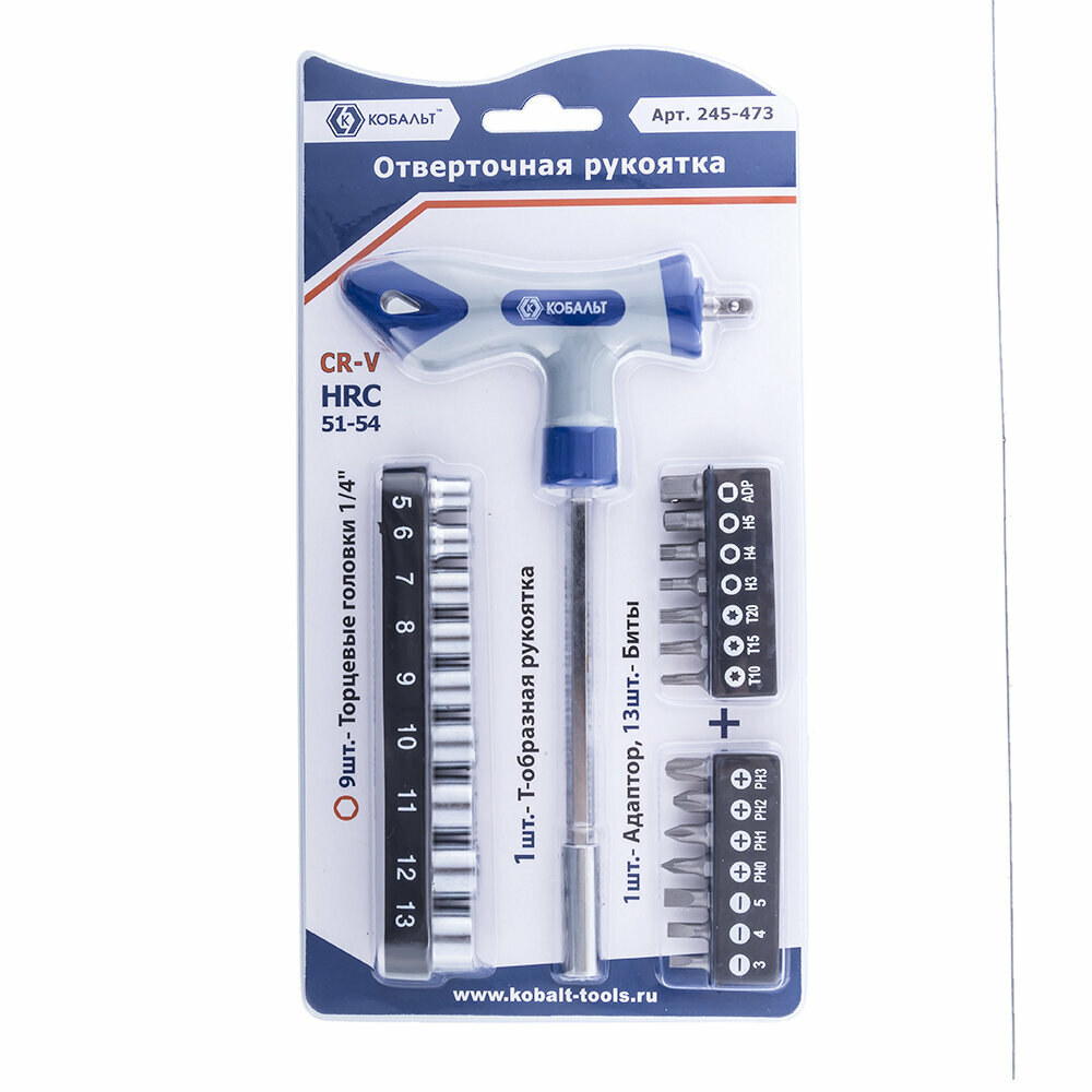 Отвертка рукоятка кобальт Т-образнаяс набором бит и торцевых головок 1/4", CR-V (24 шт.) блистер (24 шт., блистер)