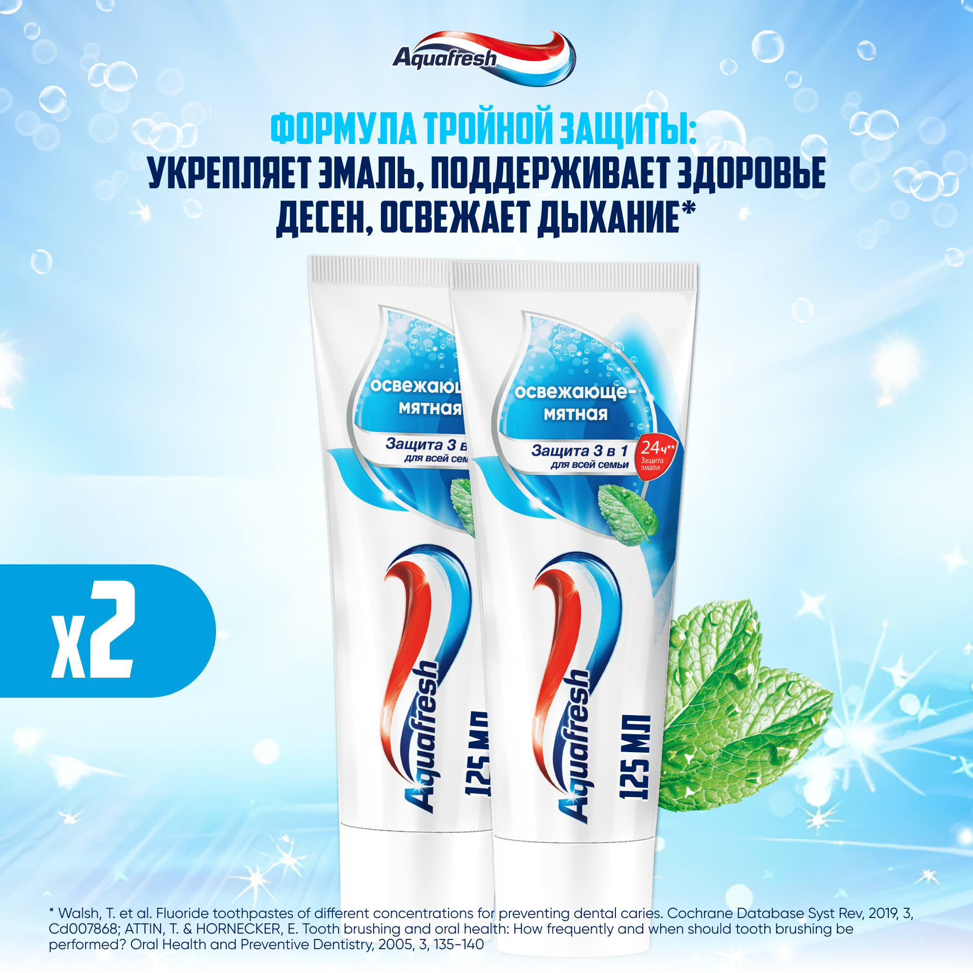 Зубная паста Aquafresh Освежающе-мятная с фтором для тройной защиты полости рта: защита от кариеса, укрепление зубов и свежесть дыхания, 125 мл 2 шт информация: