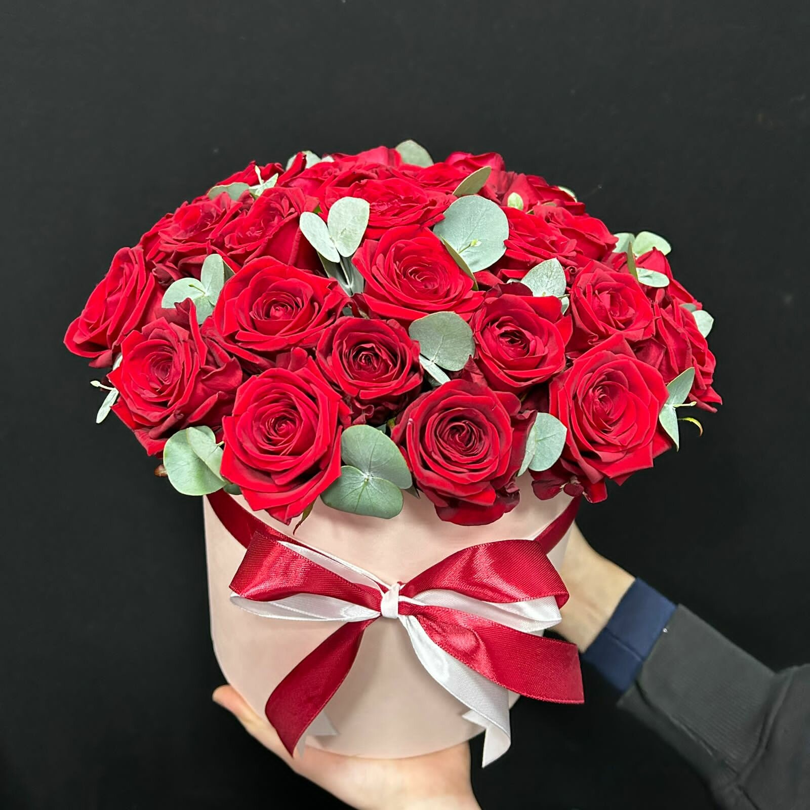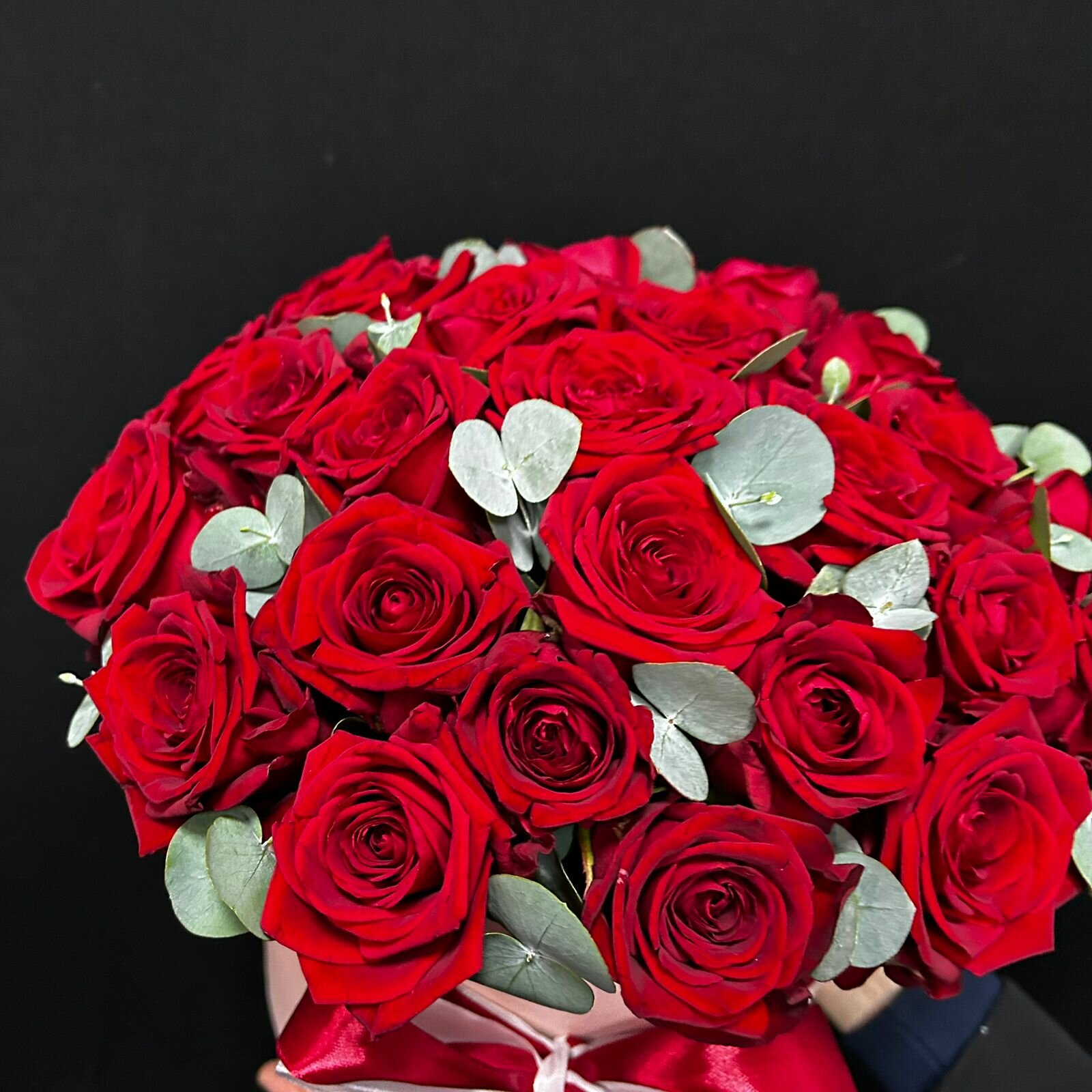 29 красных роз с эвкалиптом в шляпной коробке информация: