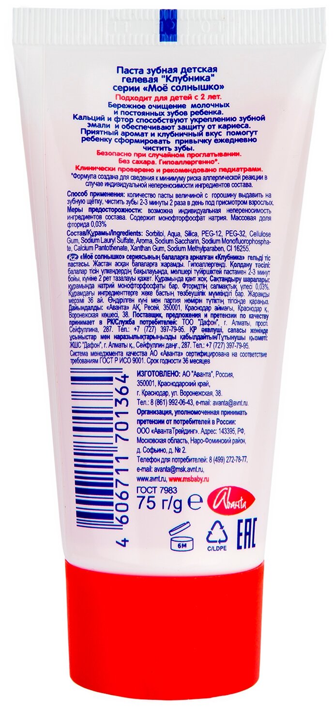 Отзывы на Зубная паста гелевая Мое солнышко Клубника 75г./В упаковке шт: 1