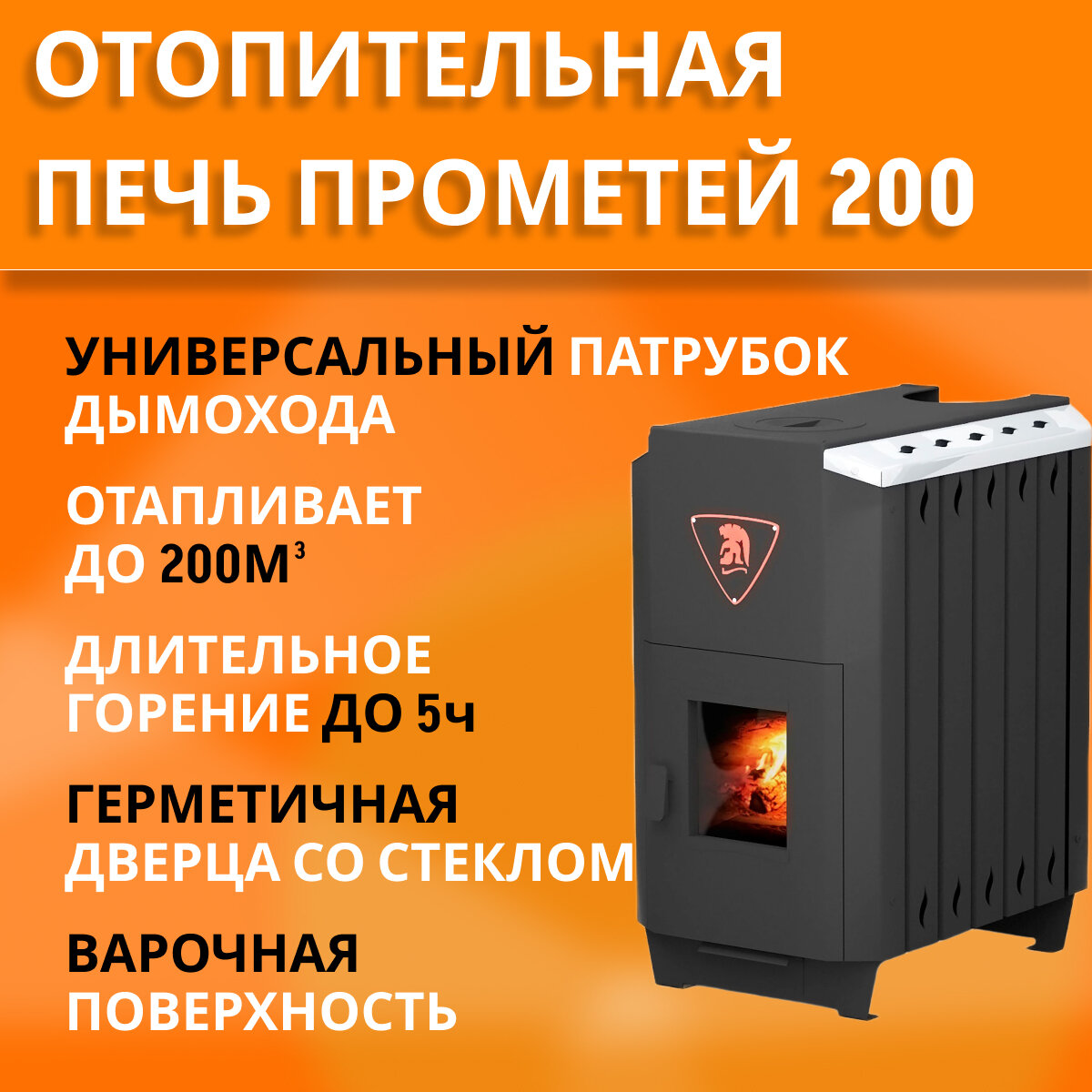Печь отопительная дровяная Прометей 200с с варочной поверхностью, дверца со стеклом, до 200м3 информация: